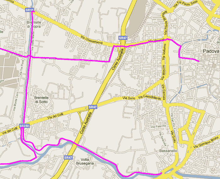 | Corso Australia | Padova, Piazza dei Signori | 2,0 | 39,0 | superato il cavalcavia (attenzione svincoli pericolosi!) pista ciclabile fino alla rotonda di Porta Savonarola, diritti Corso Milano, al semaforo destra via San Benedetto, primo ponte in ferro sinistra per le piazze |