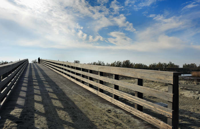 Dal parcheggio si attraversa un ponte pedonale di legno sul canale più esterno delle valli da pesca.