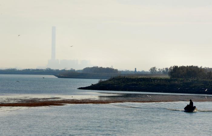 Alle quali fa da contraltare, in lontananza, la lugubre sagoma dell'enorme ciminiera (250 metri di altezza) della centrale di Polesine Camerini.