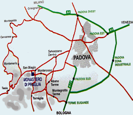 Praglia si raggiunge da Padova (15 km.) seguendo la Strada dei Colli, indicazioni.