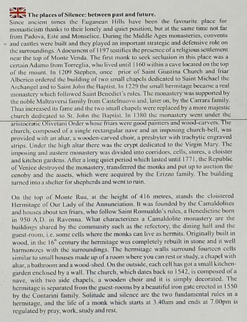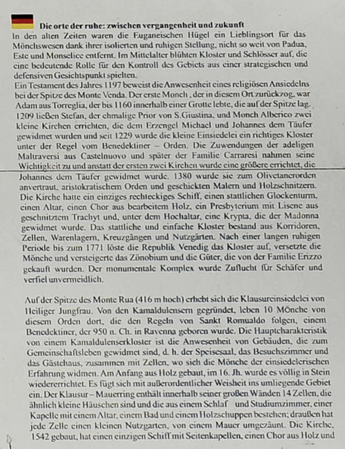 Gli affascinanti resti di quel che fu uno dei più importanti tra i monasteri ed eremi che sorgevano tra questi un tempo silenziosi ed appartati colli è ancora luogo molto meditativo e bellissimo, e dall'alto dei suoi 600 metri domina tutte le alture dell'area sud degli Euganei.