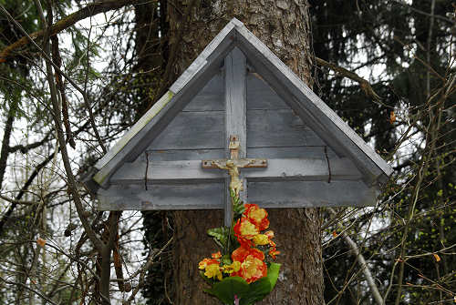 Si scende per la stradina nella Val Pezze, appena sotto il passo (m. 800) per Frassenè, in località Cristo del Pra.