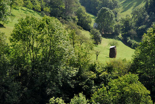 Arrivati all'ultima casa isolata si prosegue per sentiero che scende ripido nel bosco con alcuni tornantoni.