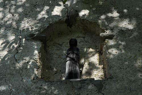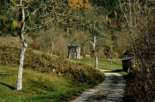 Dalla casa con la statuetta scendere brevemente alla prima curva e poi fino al primo tornante dove s'indovina nel bosco la traccia che scende apparentemente molto ripida verso valle.