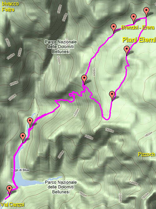 | punti appoggio | bar ristorante "Boz" (ristorante Ai 4 Pass), nei pressi della diga agriturismo malga Erera ai Piani Eterni (in stagione) - coord. N.46°09'44.1" E.11°58'56.1" |