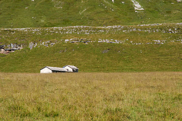 Una conca prativa di erba smeraldina con in mezzo due malghe, protetta a nord da 'strane' montagne di calcare rosso, mentre a sud s'innalza un piano inclinato di roccia tipicamente carsica con magro bosco culminante verso le strutture rocciose del Pizzoch-Tre Pietre.