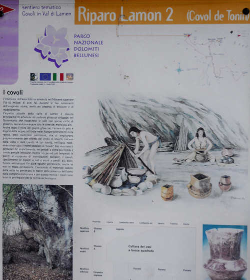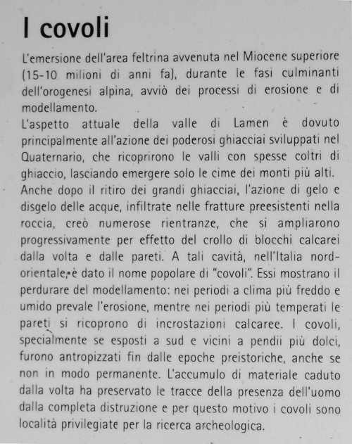 Covoli Valle di Lamen, Feltre, Parco Nazionale Dolomiti Bellunesi Attraversato il ponte sul torrente Colmeda (m. 750), piccolo parcheggio e pannello dell'Ente Parco con le indicazioni dell'itinerario (vedi le ultime foto di questa pagina), si prosegue per la stradina sterrata e si guada l'alveo di un altro torrente quasi sempre in secca.