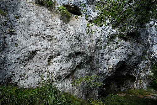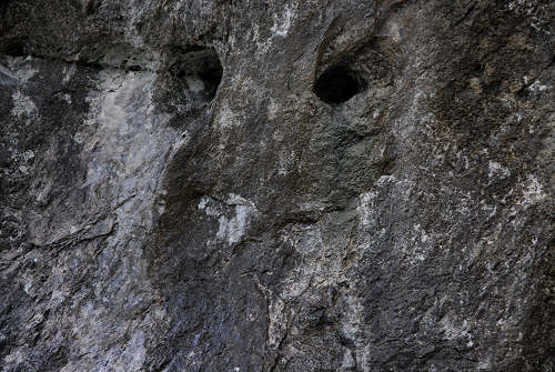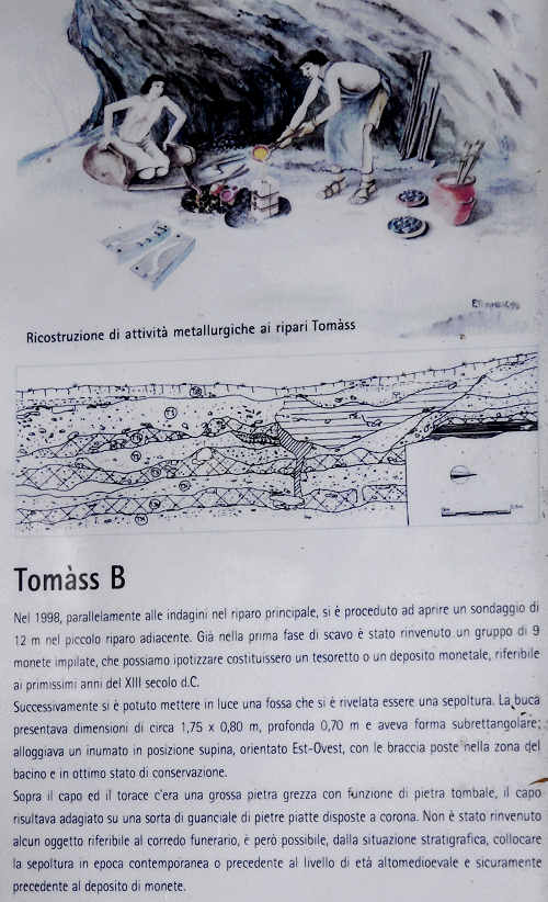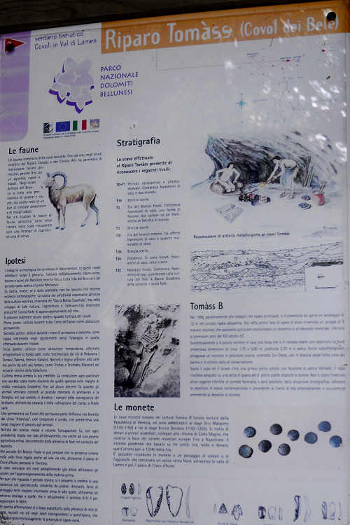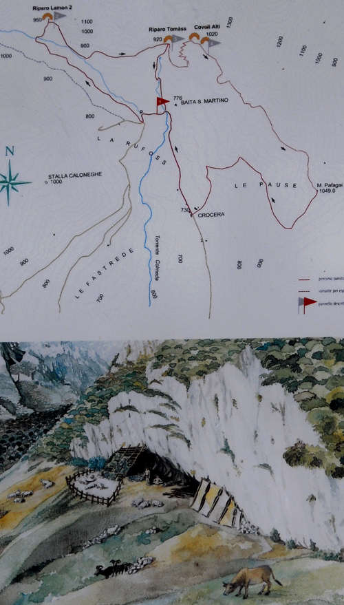 Si scende verso valle per il sentiero 815 per circa 15 min. fino ad una bella casetta. Scendere ancora poche decine di metri e verso sinistra (tabella) si stacca un sentierino che sale con alcune rampe ripide, sempre nel bosco, al primo Riparo Tomass (m.920). Proseguire ancora proprio ai piedi dell'impressionante paretone roccioso strapiombante del riparo Tomass B.