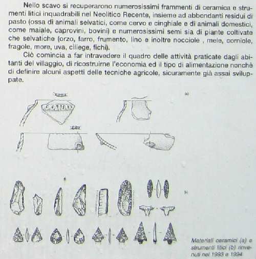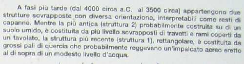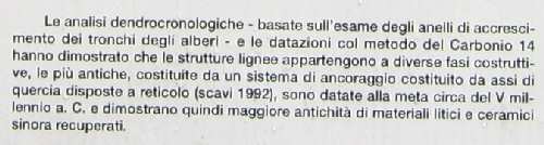 La tecnica più antica (circa 5700 anni fa) consiste in un sistema di ancoraggio formato da assi di quercia orizzontali disposte ortogonalmente a formare un reticolo a maglie regolari. Successivamente (5200 anni fa) si utilizzarono elementi strutturali orizzontali (assi, travi, travetti), mentre altre strutture più recenti, poggianti su grossi pali portanti di quercia, sono attribuibili a 4800 anni fa. I materiali recuperati nel corso delle indagini consistono in manufatti ceramici e in selce riferibili a una fase della 'Cultura dei Vasi a Bocca Quadrata'.