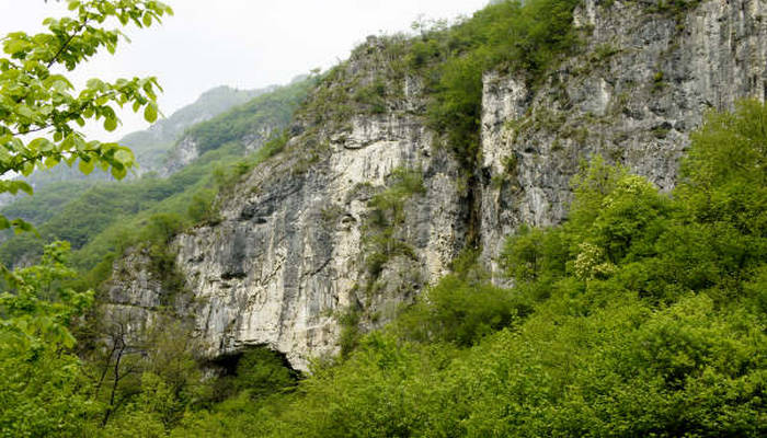 Un nuovo bivio e si svolta a destra, si oltrepassa un rivolo d'acqua e si esce sotto la grande falesia della palestra di arrampicata sportiva di Colmirano.
