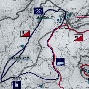 chiesa di San Marziale e si sale alla parte più alta e caratteristica del paese, all'edificio di Malga de Sora (Pro Loco di Breonio) e alla bellissima 'Fontana del Caoleto'. A fianco si dirama una stradina, evidenti indicazioni e cartello che descrive l'anello Azzurro (dal quale sono tratte le foto della mappa), che mira al vicino monte Crocetta.