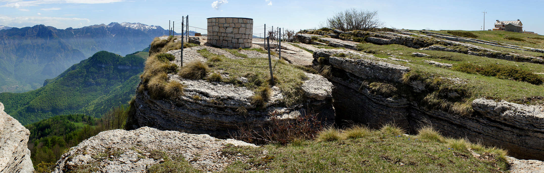 cima del Castelberto con l'osservatorio e il rifugio Castelberto, sullo sfondo il gruppo del Carega Piccole Dolomiti