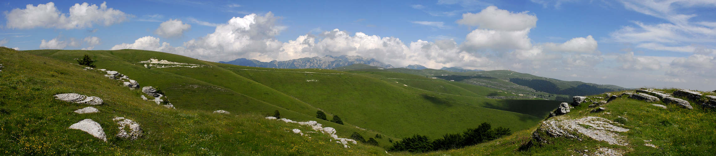 Alta Lessinia, dai pressi di malga Lessina (Erbezzo) e del bivio di Castelberto (m.1700) uno sguardo sulla stradina 'dei cordoni' ed i pascoli attorno alla Podestaria (m.1650). Sullo sfondo il gruppo del Carega (m.2259).