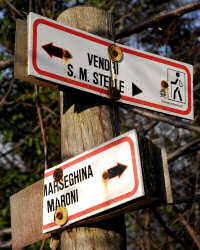Verso destra si scende direttamente alla parrocchiale di Santa Maria in Stelle, verso sinistra si amplia il giro scendendo alla chiesetta di Vendri.
