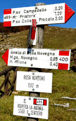 Verso nord, sempre per balze prative, scendere alla stradina della Busa del Novegno e proseguire al bivio di sentieri sotto Cima Alta.