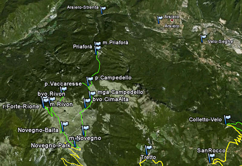 baita Davanti, croce del Novegno, bivio Cima Alta, passo Campedello, buco e croce Priaforà, passo Campedello, Vaccaresse, cima Rione, parcheggio Novegno