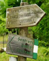 Superato un tratto di bosco, dove possiamo osservare una vecchia 'giazzera' (grotta dove venivano conservati alimenti), sbuchiamo alla radura di alcune vecchie case e alla contrada Santagiuliana di Sopra.