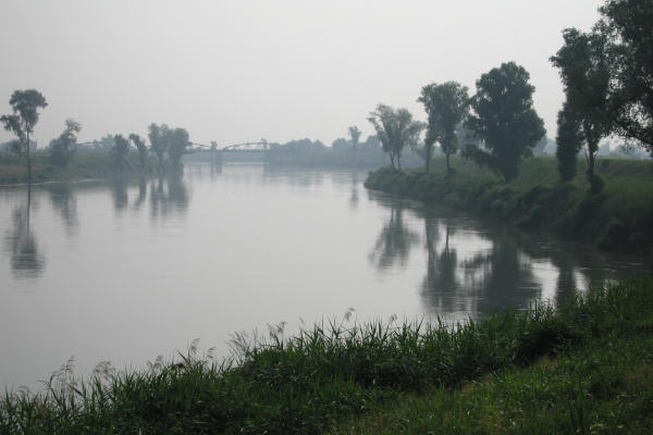 Raggiunta Legnago il fiume si può attraversare per uno spettacolare ponte pedonale, servito da due ascensori che permettono di salire sugli argini in questo tratto davvero altissimi.