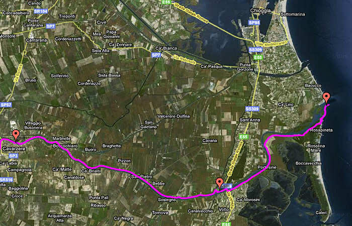 - da Cavarzere a Rosolina Mare - argine destro asfaltato strada principale, argine sinistro asfaltato strada locale fino a Cavanella d'Adige, da Cavanella d'Adige ponte sulla statale Romea e argine destro fino a Rosolina