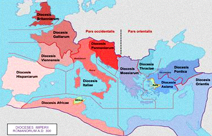 suddivisione in Diocesi dell'impero romano nel 300 d.C. con l'istituzione della Tetrarchia