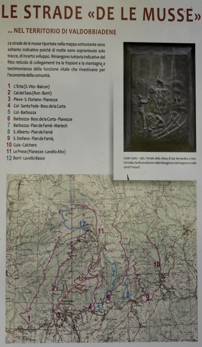 Al bivio svoltiamo decisamente a sinistra, la stradina termina ad una bella casetta e da qui parte la "Strada delle Musse", un sentiero selciato che serviva a far scendere a valle le 'slitte' cariche di fieno (vedi foto pannelli didattici).