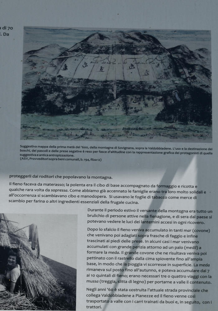 Dal taglio, ovviamente a mano, del fieno, allo stoccaggio nelle 'Mede' (o pigne), al carico e al trasporto a valle con le 'Musse' (le apposite slitte) percorrendo le 'Strade delle Musse', degli appositi sentieri selciati in forte discesa che permettevano di far scivolare l'antico mezzo di trasporto, guidato e frenato da un uomo d'esperienza.