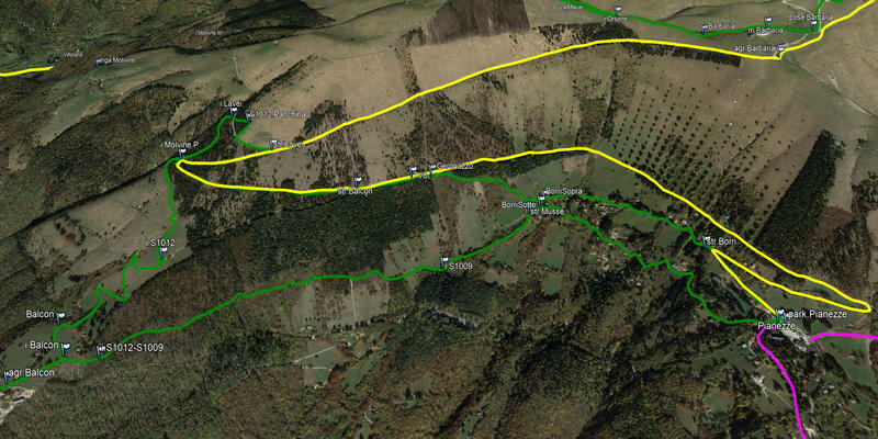 Pianezze di Valdobbiadene (m.1070), Borri di Sotto (m.1070), agriturismo Balcon (m.990), tornante bivio malga Molvine (m.1200), monte Orsere-Barbaria, case Geronazzo, Borri di Sopra (m.1090), Pianezze (m.1080)
