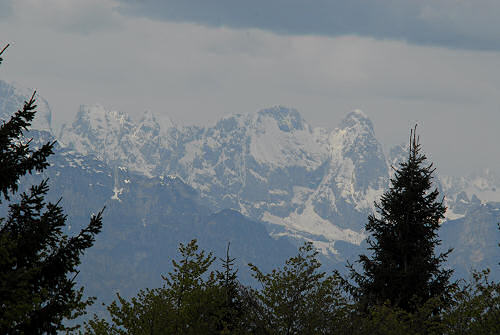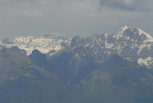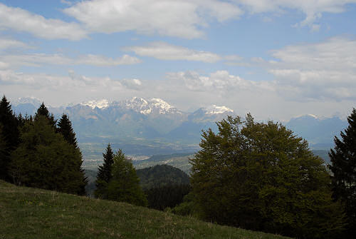 Dall'altra parte della dorsale si vedono ampi sprazzi della Valbelluna e tutta la cerchia delle Dolomiti Bellunesi, dalla Schiara, dove si individua facilmente la Gusela, alle Vette Feltrine con il Pavione.