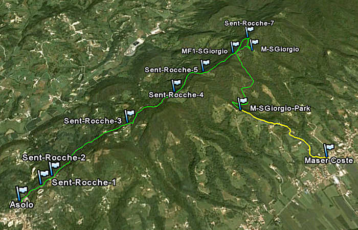 Partendo dal centro di Asolo dalla porta nord si sale la gradinata verso la Rocca, si prosegue per la stradella di sinistra, si continua lungamente sul versante nord dei vari risalti collinari (in alcuni casi raggiungibili con varianti) alternando stradine sterrate a tratti di sentiero umido.