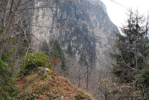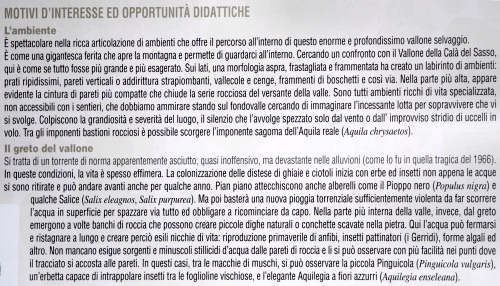 Si può poi continuare sul sentiero, una mulattiera costruita negli anni venti dai valligiani Valstagnotti, a 'proprie spese' come recita un cartello, a tratti disagevole ma facile, attraversando ripetutamente il torrente che in primavera presenta numerose spumeggianti cascatelle, al cospetto di imponenti ed austere pareti rocciose alte diverse centinaia di metri, nella speranza di scorgere l'aquila che vi nidifica.